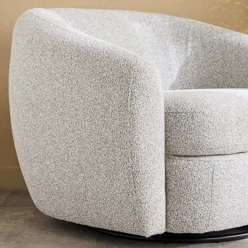 كرسي بذراعين مزود بوسادة واحدة يجمع بين الراحة والأناقة، بتنجيد قماشي مزخرف وتصميم مستدير، وقاعدة دوارة عملية، مثالي لغرف المعيشة والنوم، يمكن تنسيقه مع مسند قدم لتعزيز الراحة.
